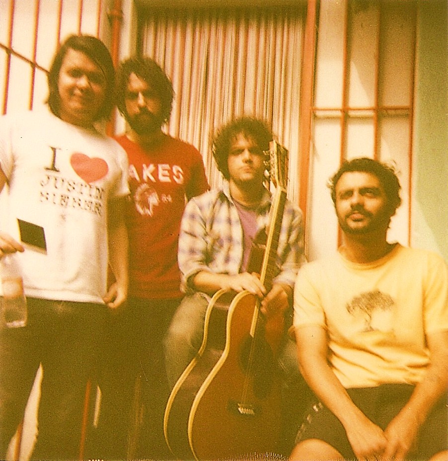 Depois de quinta e sexta de ensaios e bizarrices noturnas, finalmente tocamos “Um Futuro Inteiro” na íntegra e na ordem na Casa do Mancha sábado. Curtimos tanto ter o Mancha na bateria e ele tirou tão bem todas as músicas do disco, que pensamos “que diabos! Entra logo pra banda, General”. Ainda não brotaram fotos deste concerto na internet, mas depois registramos a nova formação com essas incríveis Polaroids atiradas por Tomahawk (ou Juninho, nosso artista number 1 de capas supercordianas):