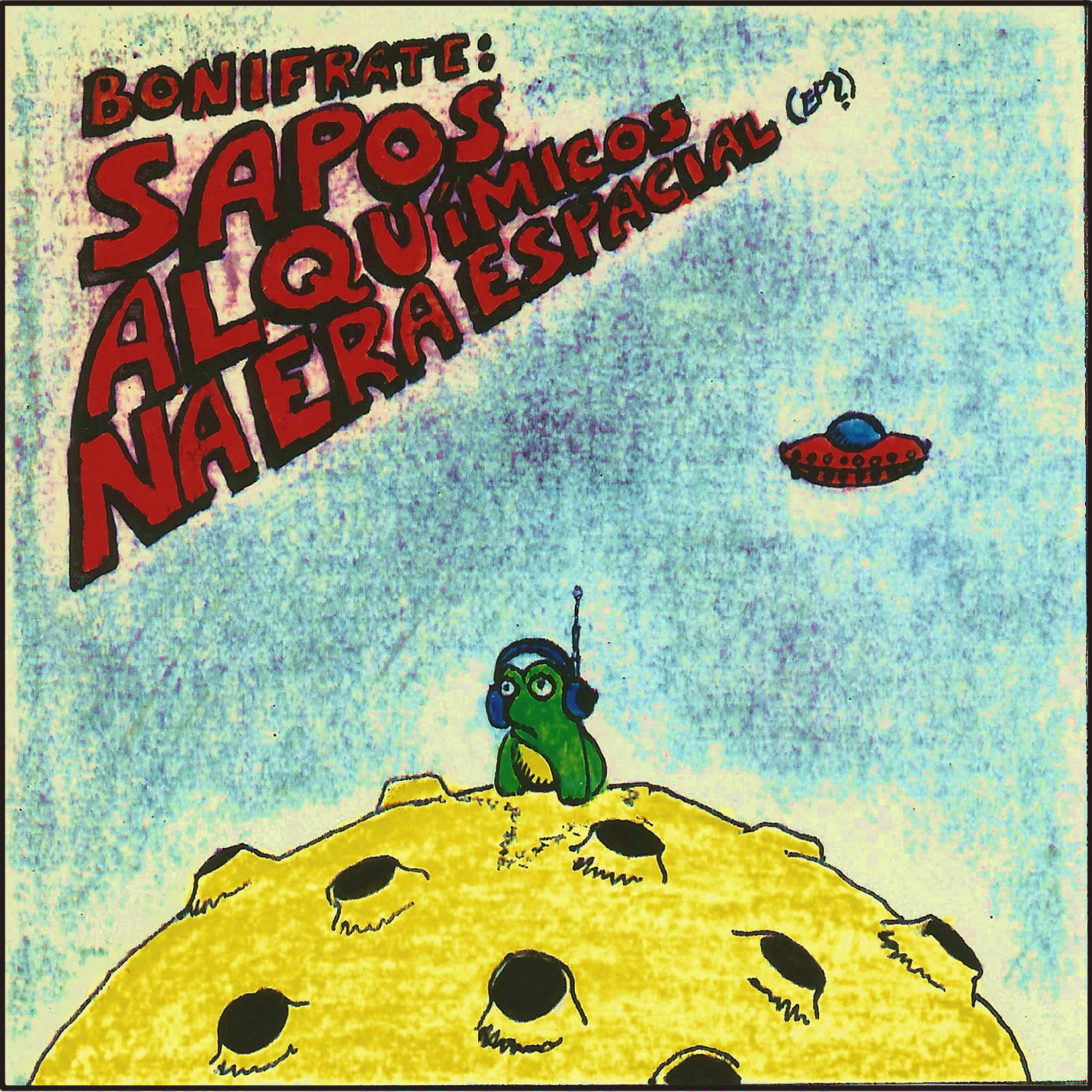 Sapos alquímicos - capa em alta editNo verão de 2001 para 2002 eu fazia em Paraty as primeiras gravações como Bonifrate, reunidas na fita super lo-fi Sapos alquímicos na Era Espacial (EP?). Muitas das primeiras canções em português que eu escrevi estão aí, o único outro idioma presente está em “Mae’r llyfr ar y bwrdd” – um exercício de composição em galês. O EP foi gravado em 4 canais, direto na fita cassete, num tempo em que eu mal entendia o uso de coisas como delays ou reverbs, e contém versões originais de músicas posteriormente regravadas como “Seqüelagem” (em Toca do Cosmos EP, Bonifrate, 2014) e “Frog Rock” (em Seres verdes ao redor, Supercordas, 2006). Mais ou menos na mesma época, eu e Valentino, futuros Supercordas, fazíamos o único concerto do Vitrola Photossintética, no Armazém Caborê em Paraty, junto com Adriano na bateria e Matheus nas percussões e ruídos (foto abaixo, pra se ter uma ideia de como éramos moleques). Muito do repertório deste show saiu do Sapos alquímicos. Agora a peça está novamente disponível para download, com remasterização caseira e 3 faixas bônus, gravadas em abril de 2002. Essas canções apareceram no single Substâncias cósmicas. A primeira, faixa título do single, deve ser das mais desconhecidas. A segunda, “Unicórnio 2D”, andou circulando por aí depois de entrar na trilha do filme independente Apenas o fim, de Matheus Souza. A terceira, “O álcool é piegas”, foi regravada em 2005 para o disco Os anões da Villa do Magma, lançado pela Open Field Records em 2007. Recomendo pra quem não se importa em ouvir sons toscamente gravados e tocados, e pra quem se interessa pelas raízes de algumas das intuições musicais que desaguaram na música que faço hoje. Escute abaixo, ou clique em “download” e entre “0” para baixar gratuitamente.
